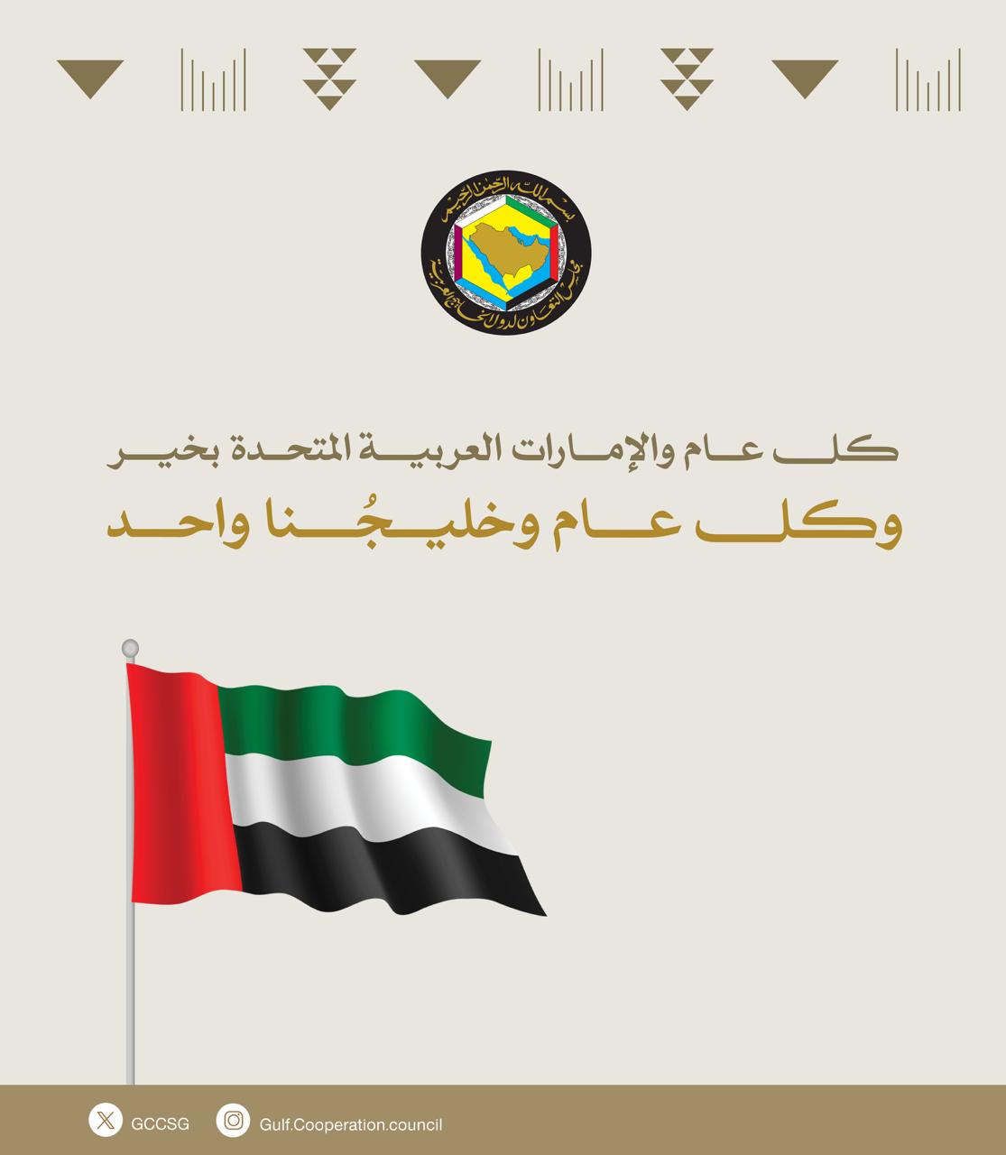 ​رفع معالي الأستاذ جاسم محمد البديوي، الأمين العام لمجلس التعاون لدول الخليج العربية، أسمى آيات التهاني والتبريكات إلى مقام صاحب السمو الشيخ محمد بن زايد آل نهيان، رئيس دولة الإمارات العربية المتحدة -حفظه الله ورعاه-، وإلى الشعب الإماراتي الكريم بمناسبة اليوم الوطني الرابع والخمسين لدولة الإمارات العربية المتحدة.